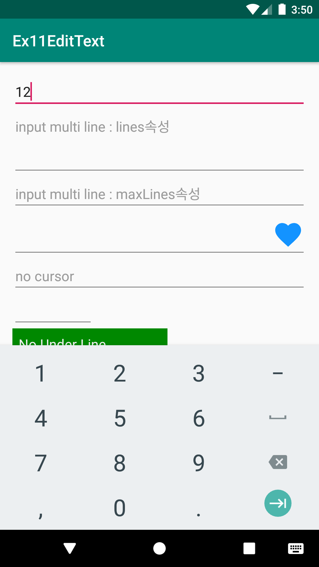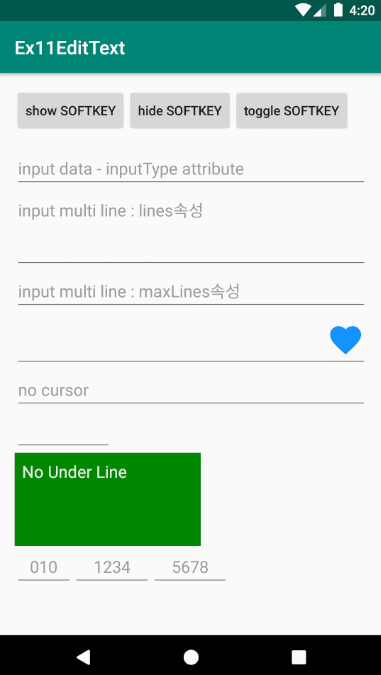 - inputType속성값 (text, number, phone, textPassword 등)에 따라 디바이스의 입력 소프트키패드가 다른 UI모양으로 보여짐