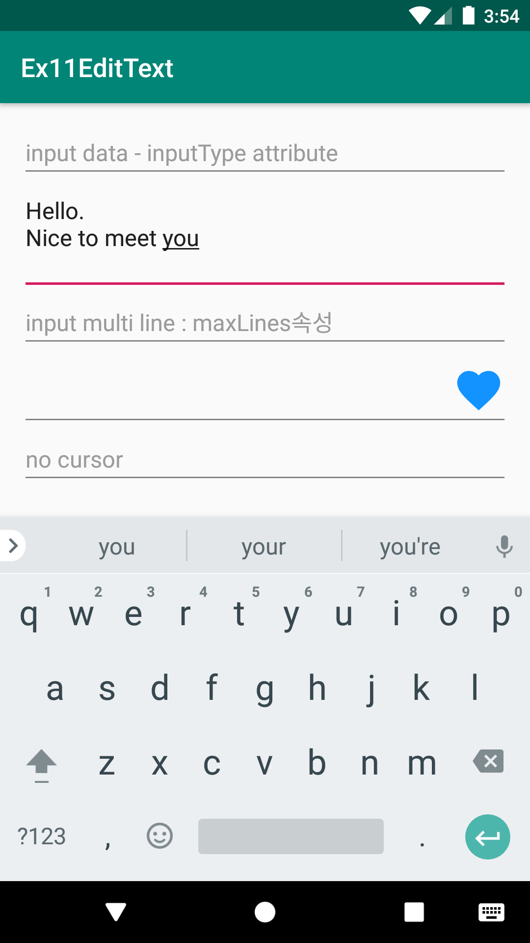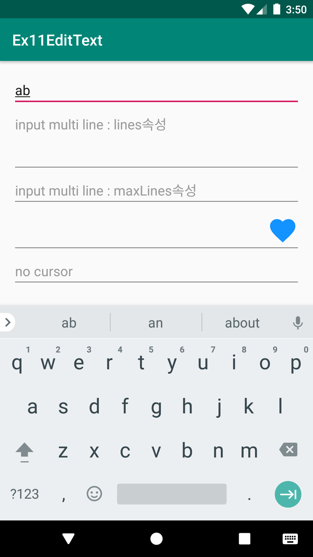 - 여러줄 입력 : inputType="textMultiLine" 및 ultiLine의 뷰 높이 관련속성 lines , maxLines