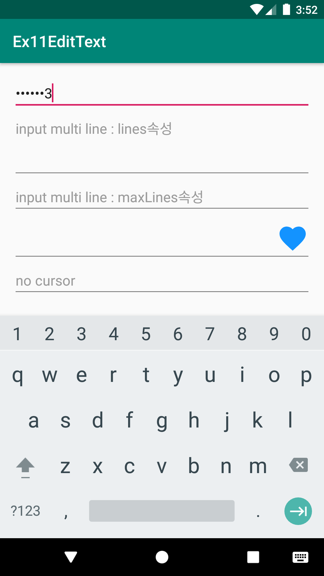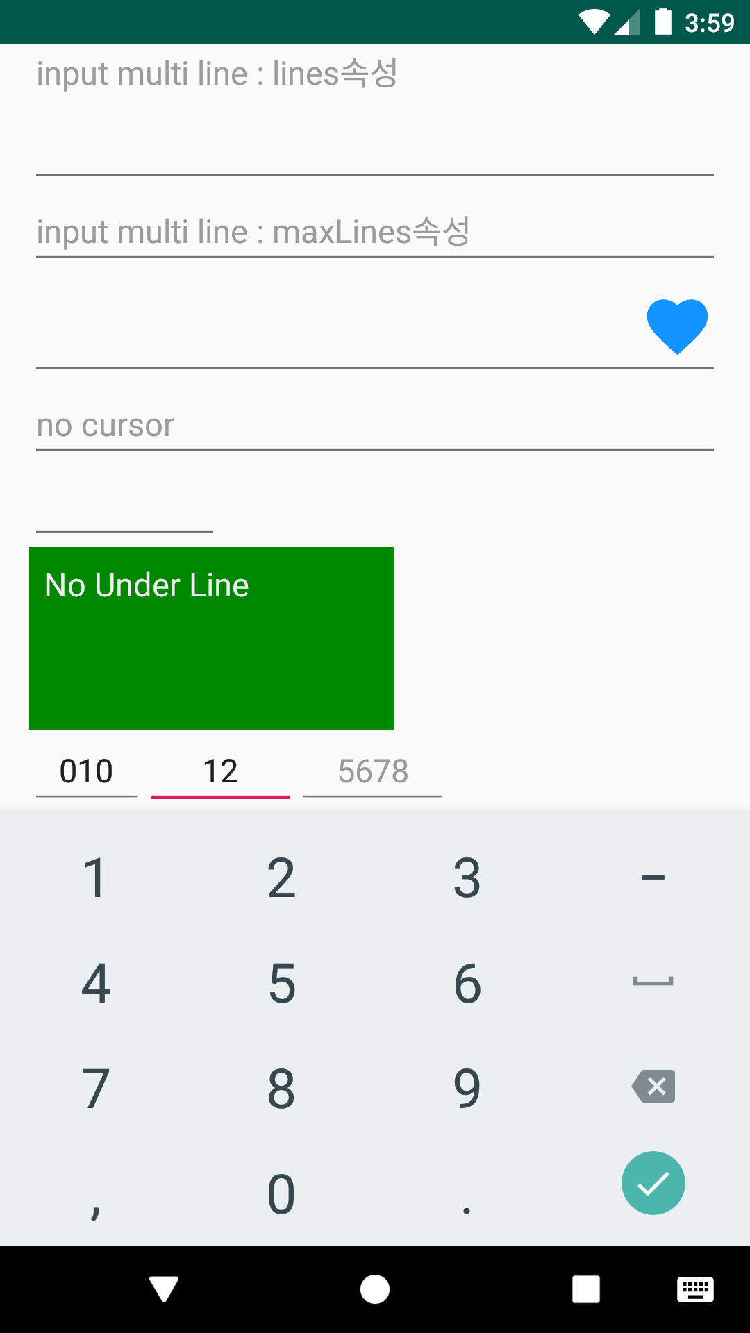 - inputType속성값 (text, number, phone, textPassword 등)에 따라 디바이스의 입력 소프트키패드가 다른 UI모양으로 보여짐