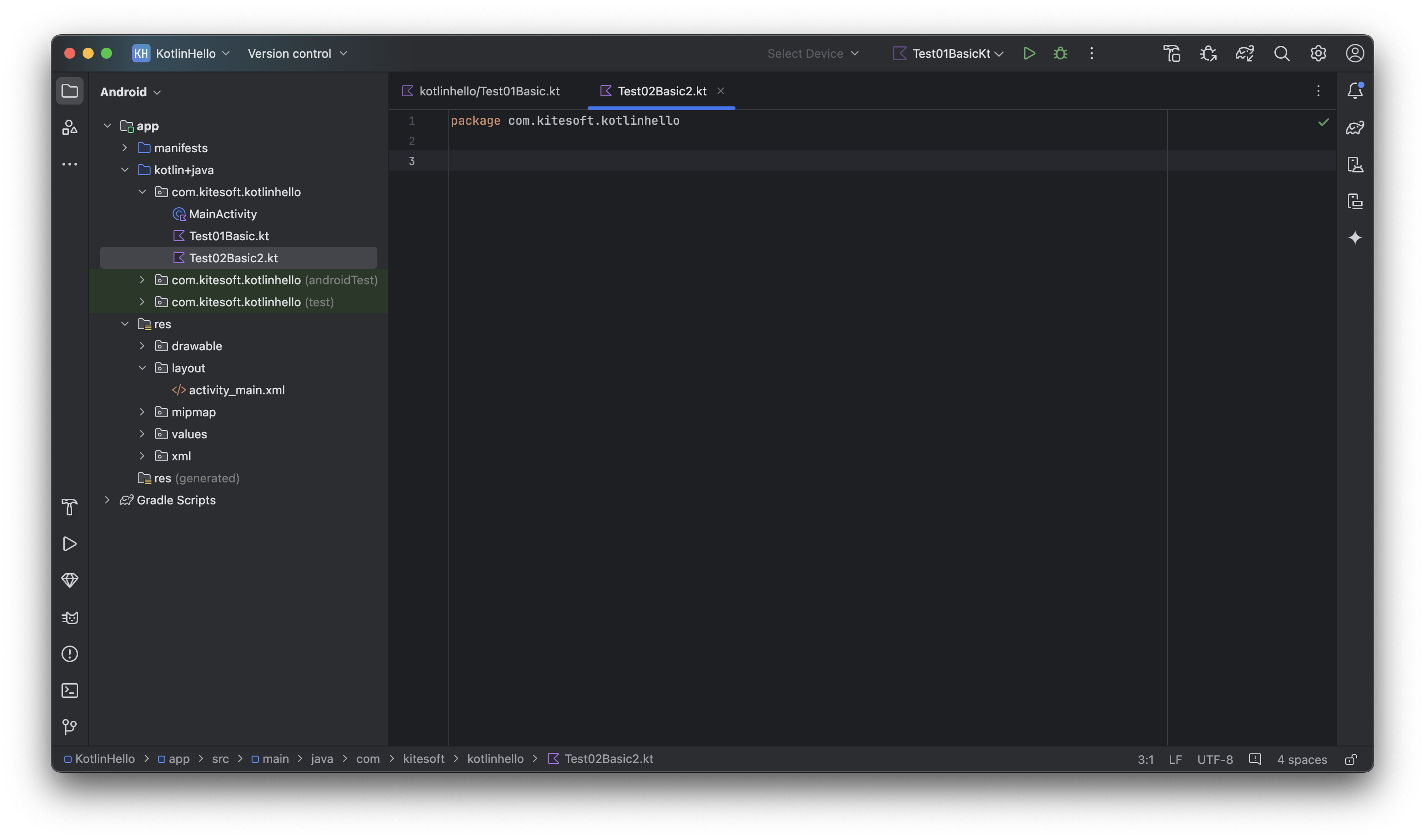 새로 만든 Test02Basic2.kt 문서만 따로 실행할 수 있도록 문서의 빈 공간에서 마우스 우클릭하여 나타난 팝업 메뉴에서 해당 문서의 Run메뉴를 실행하면 안드로이드 스튜디오 상단메뉴의 run 메뉴 툴바의 대상이 아래그림처럼 Test02Basic2Kt로 된 것을 확인할 수 있습니다.