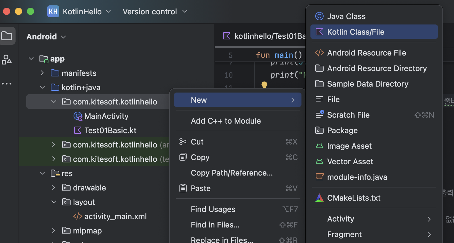 새로운 .kt 파일을 만들어서 실습을 해보겠습니다. 이전 글을 통해 android studio에서 코틀린파일을 만드는 것을 해봤으니 하실 수 있겠죠? 혹시나 해서 별도의 파일의 생성하는 new >> Kotlin Class/File 메뉴를 통해 새로운 .kt 파일을 만들어 보겠습니다.