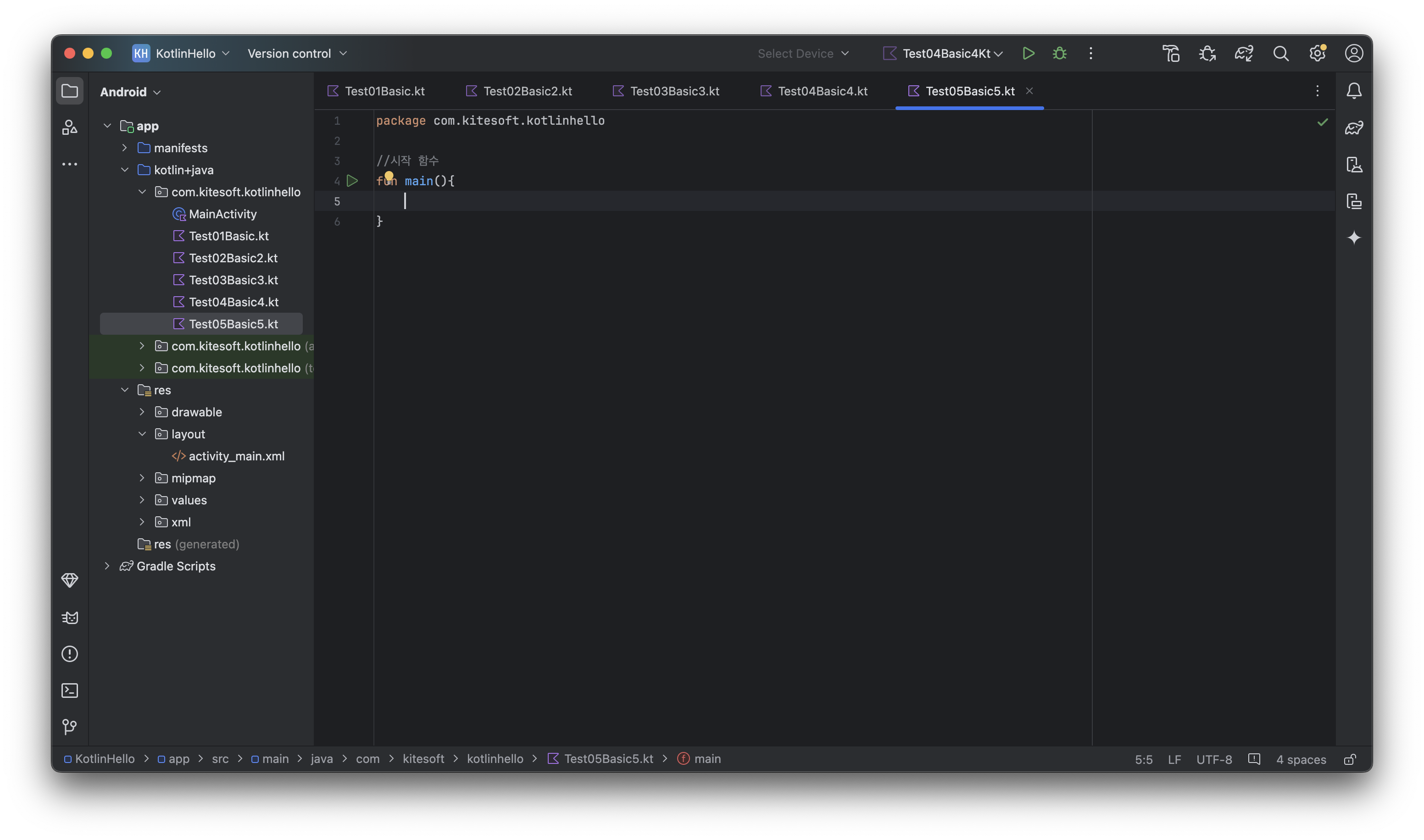 새로운 코틀린 파일 Test05Basic5.kt 를 만들고 문법을 알아보겠습니다.