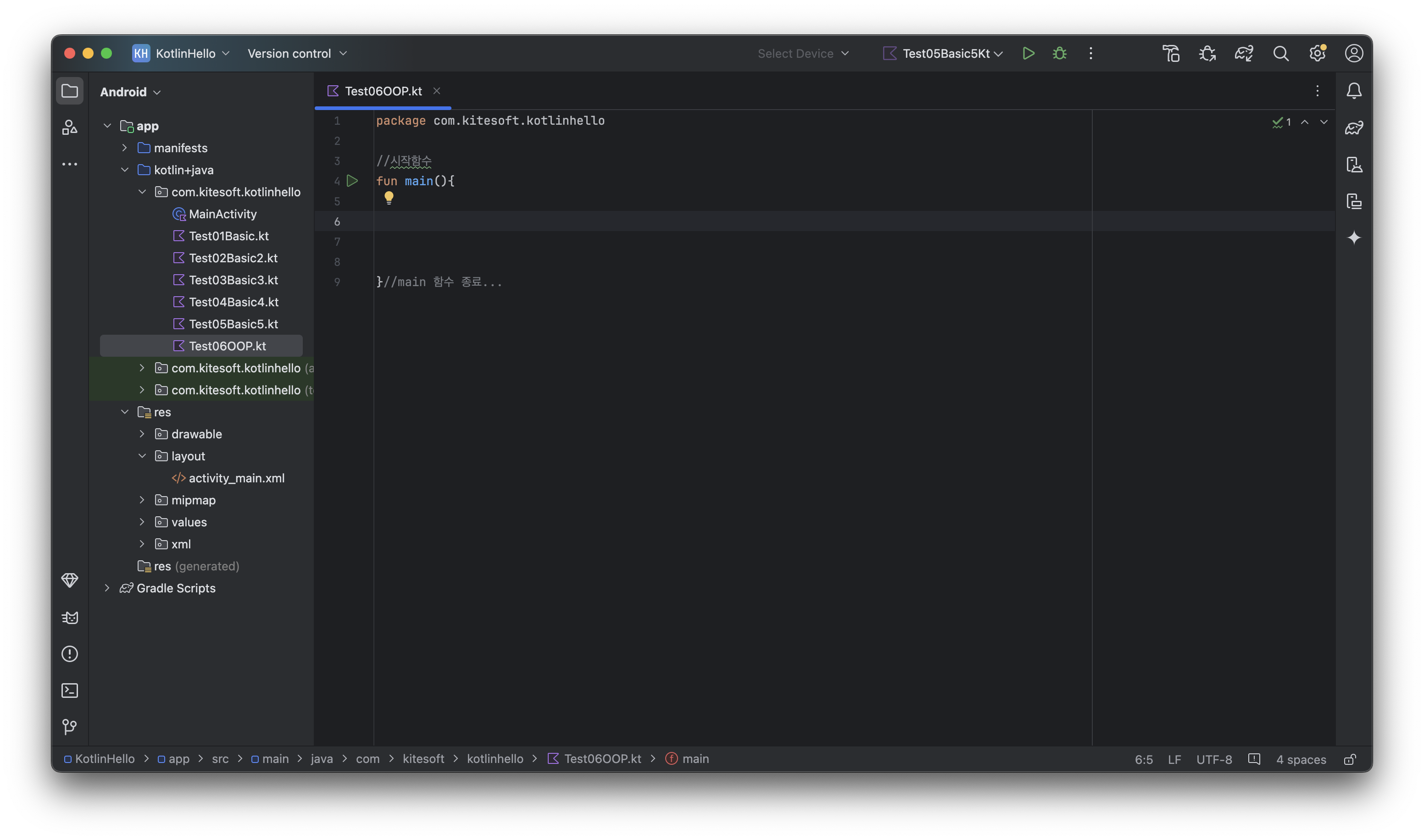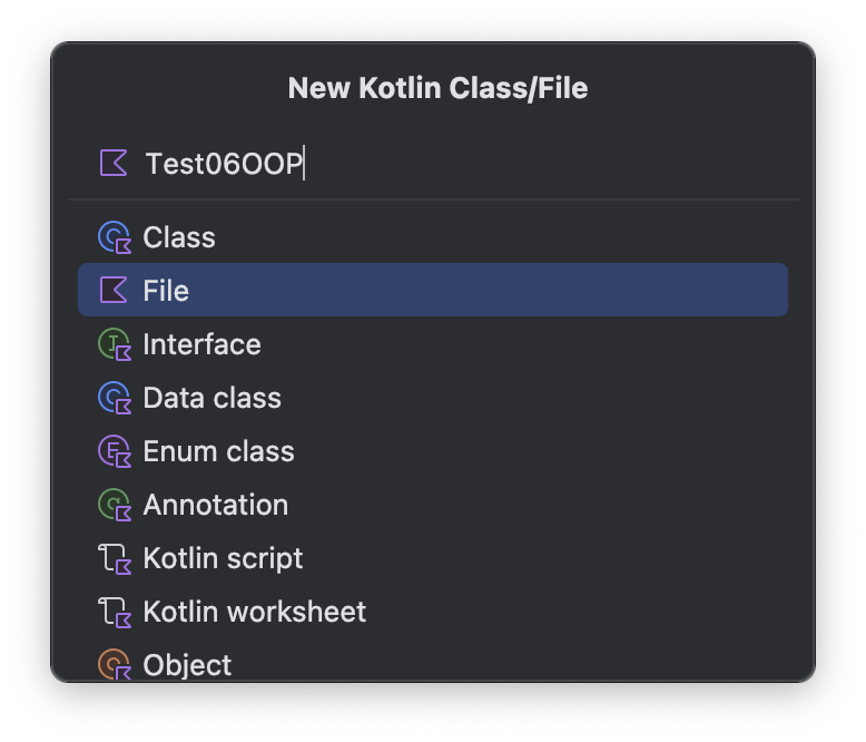 새로운 코틀린 파일 Test06OOP.kt 를 만들고 문법을 알아보겠습니다.