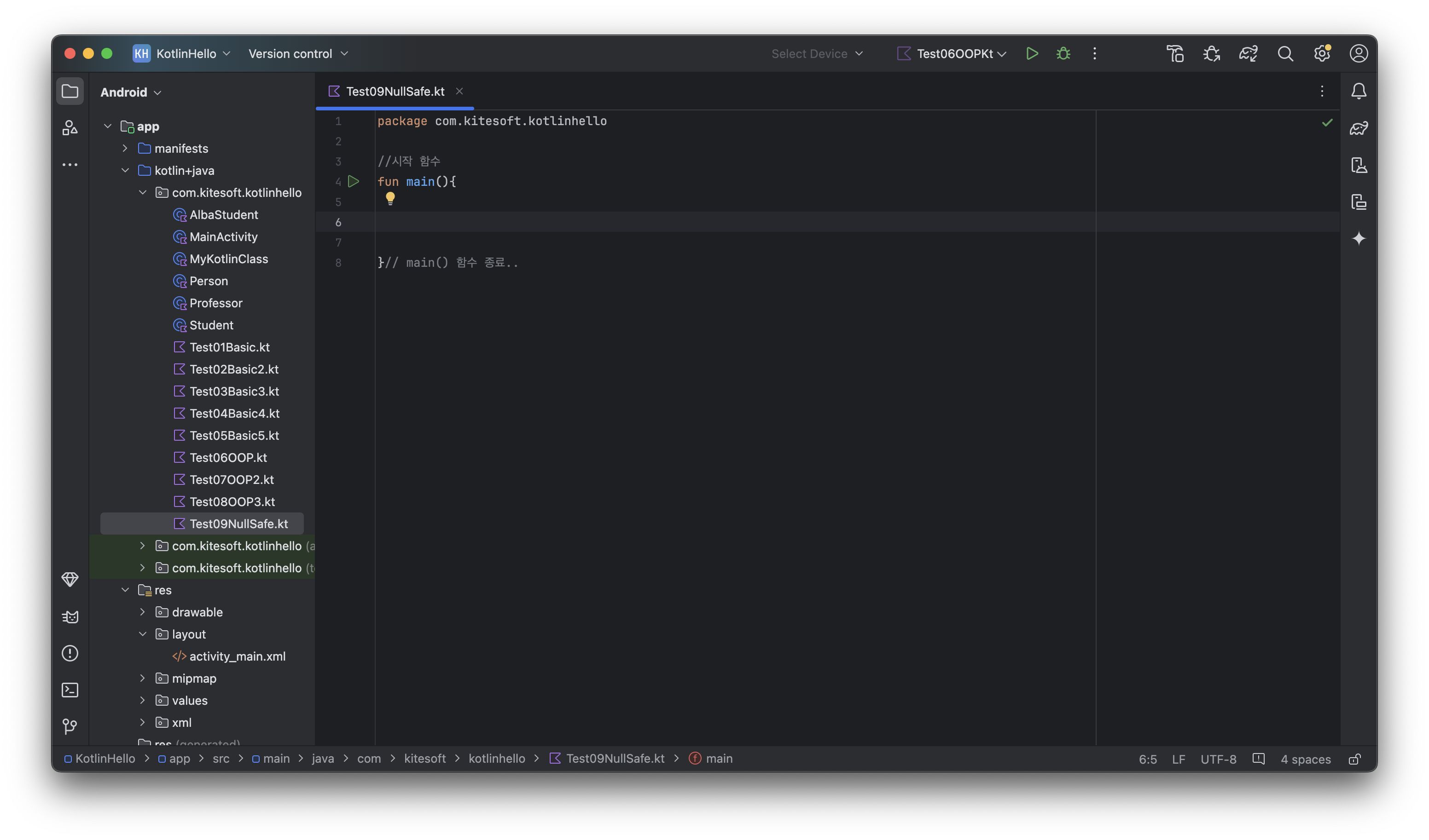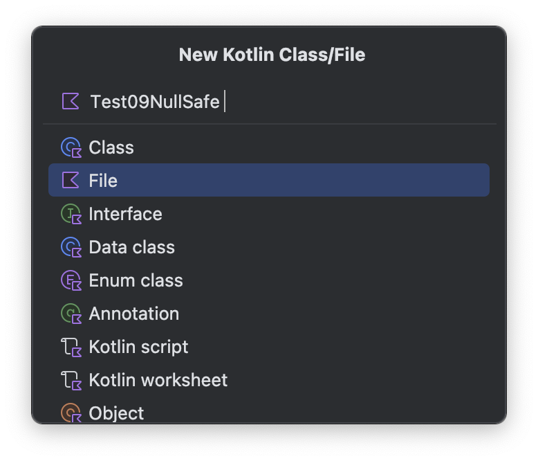 새로운 파일 Test09NullSafe.kt 을 만들고 문법들에 대해 알아봅시다.
