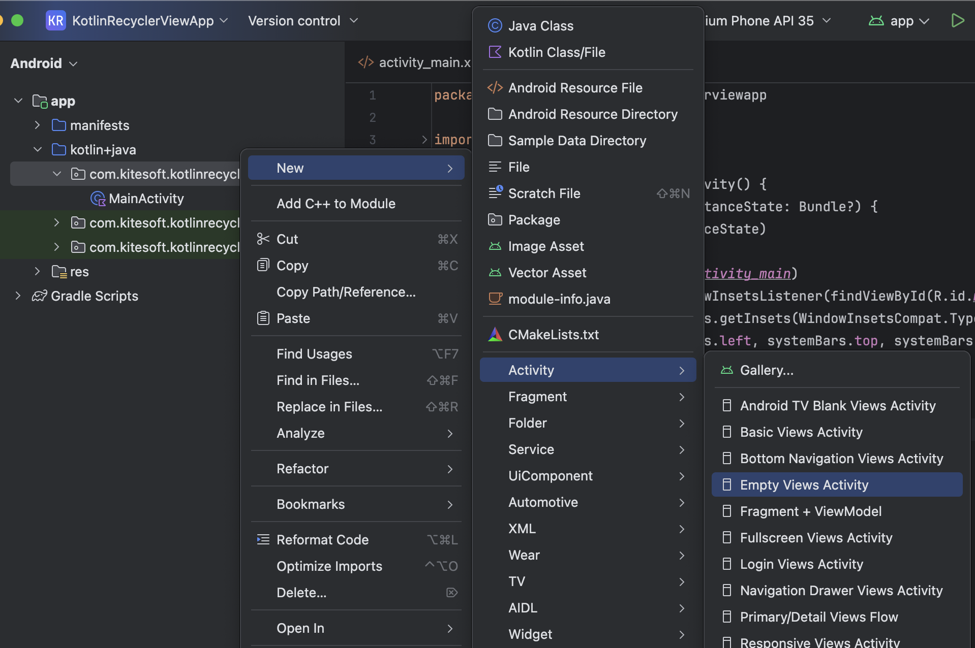 New > Activity > Empty Views Activity