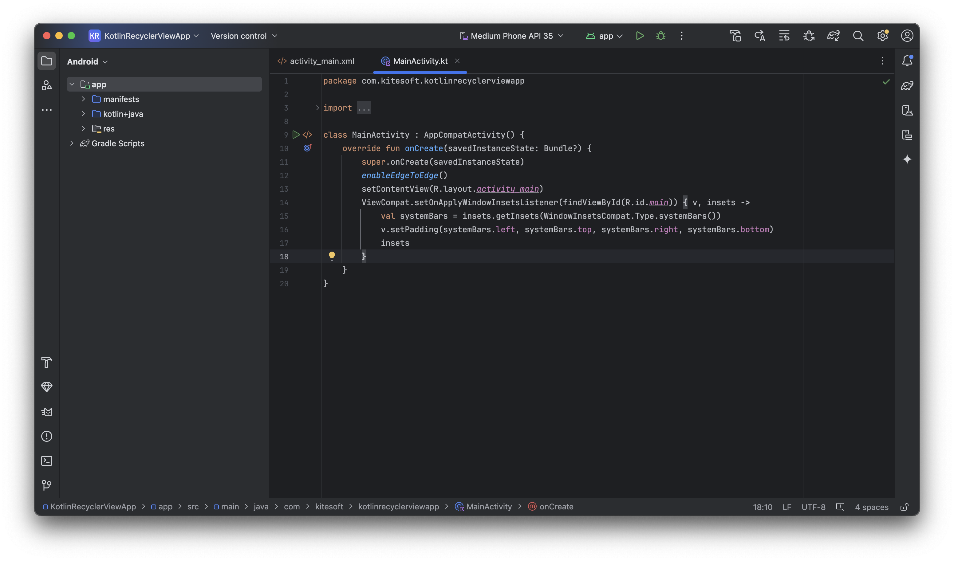 이번 예제에서는 코틀린을 이용한 앱 개발 코드에 집중하기 위해 EdgeToEdge 관련 코드는 모두 제거하고 액티비티가 보여줄 뷰를 설정하는 setContentView()만 남겨두고 설명을 이어가겠습니다.