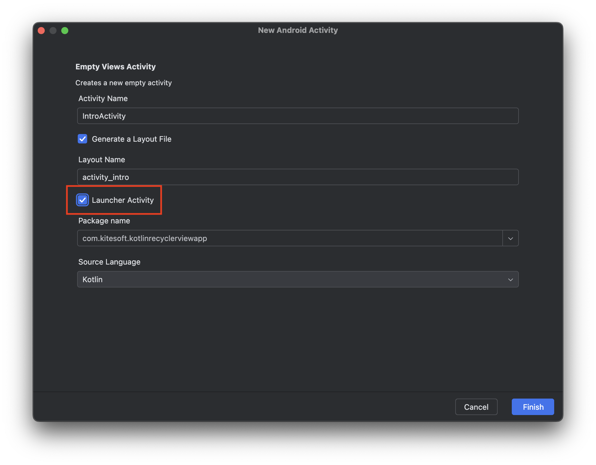 앱의 진입 화면으로 사용하는 액티비티 이기에 생성할 때 [ Launcher Activity ] 체크박스를 체크해 주시기 바랍니다.