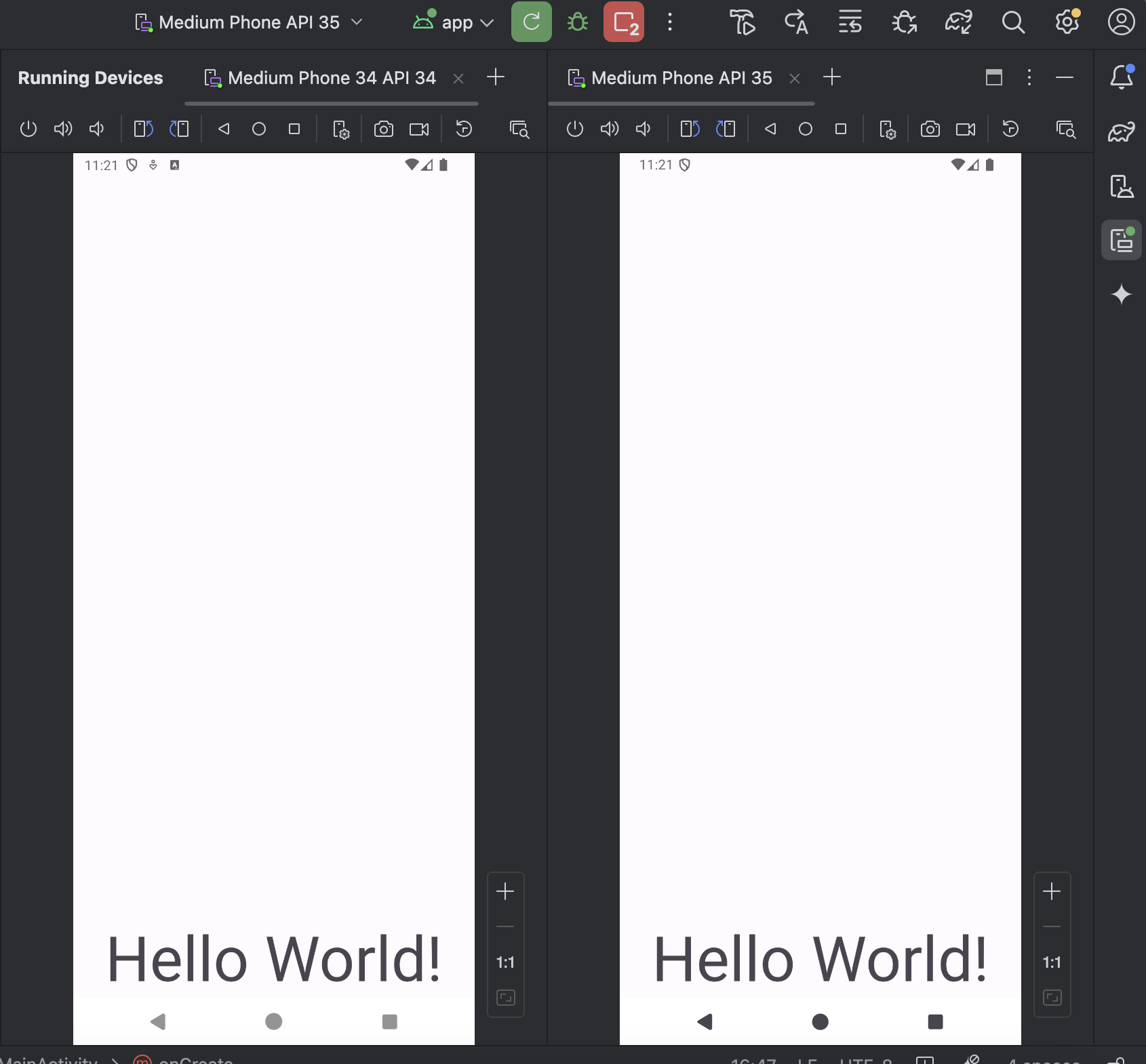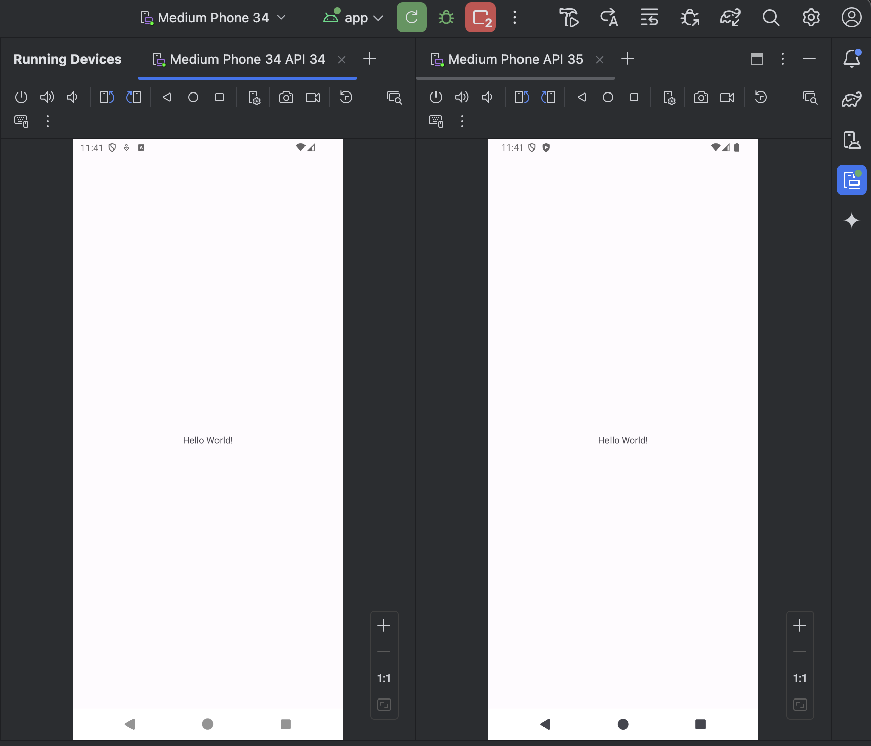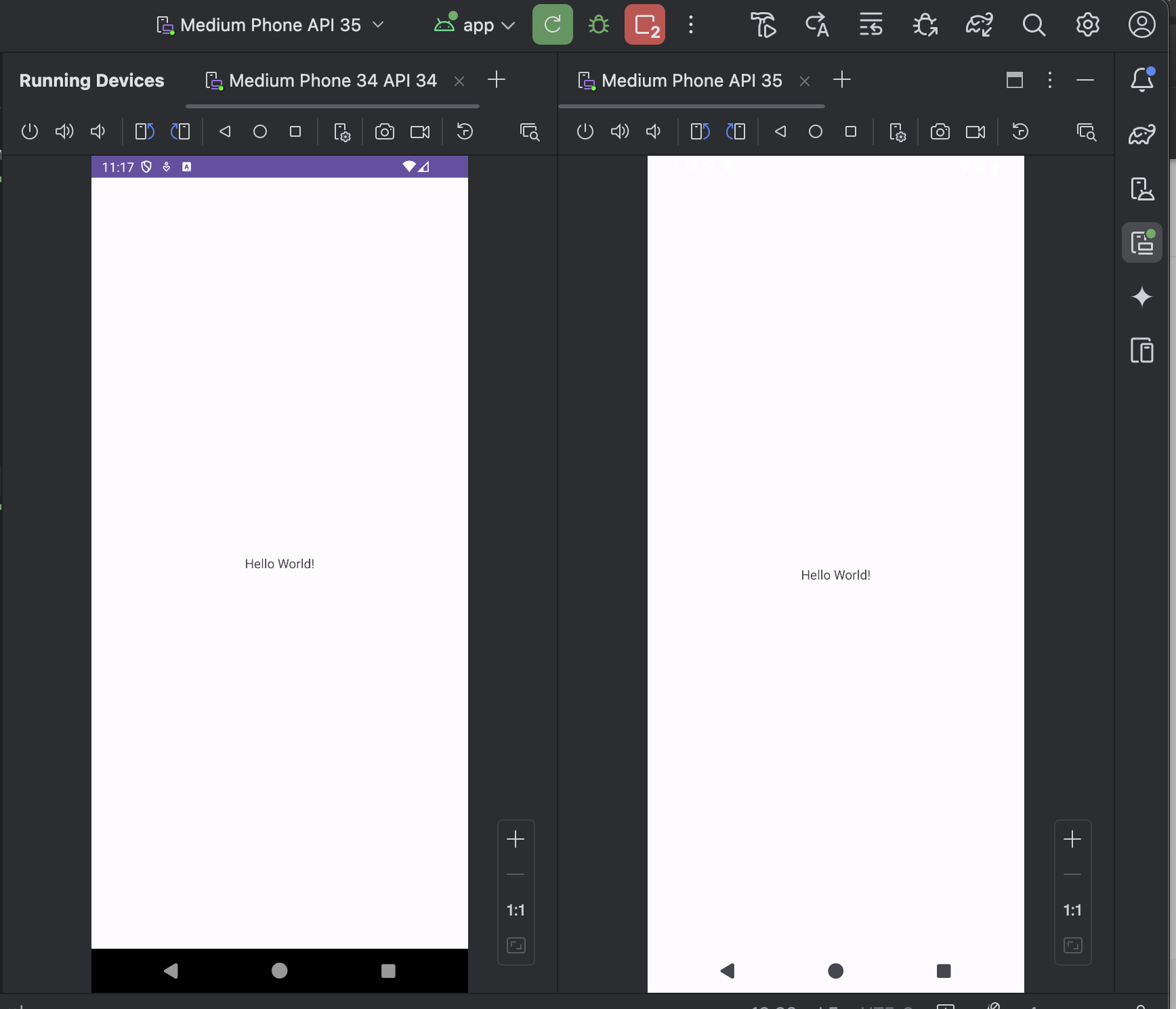 이제 준비가 되었으니 EdgeToEdge 가 적용되지 않았을때 35버전 이전과 이후가 다른 점을 확인해 보겠습니다. 동시에 실행해야 하는 만큼 디바이스 target 을 변경하면서 run 을 하겠습니다.