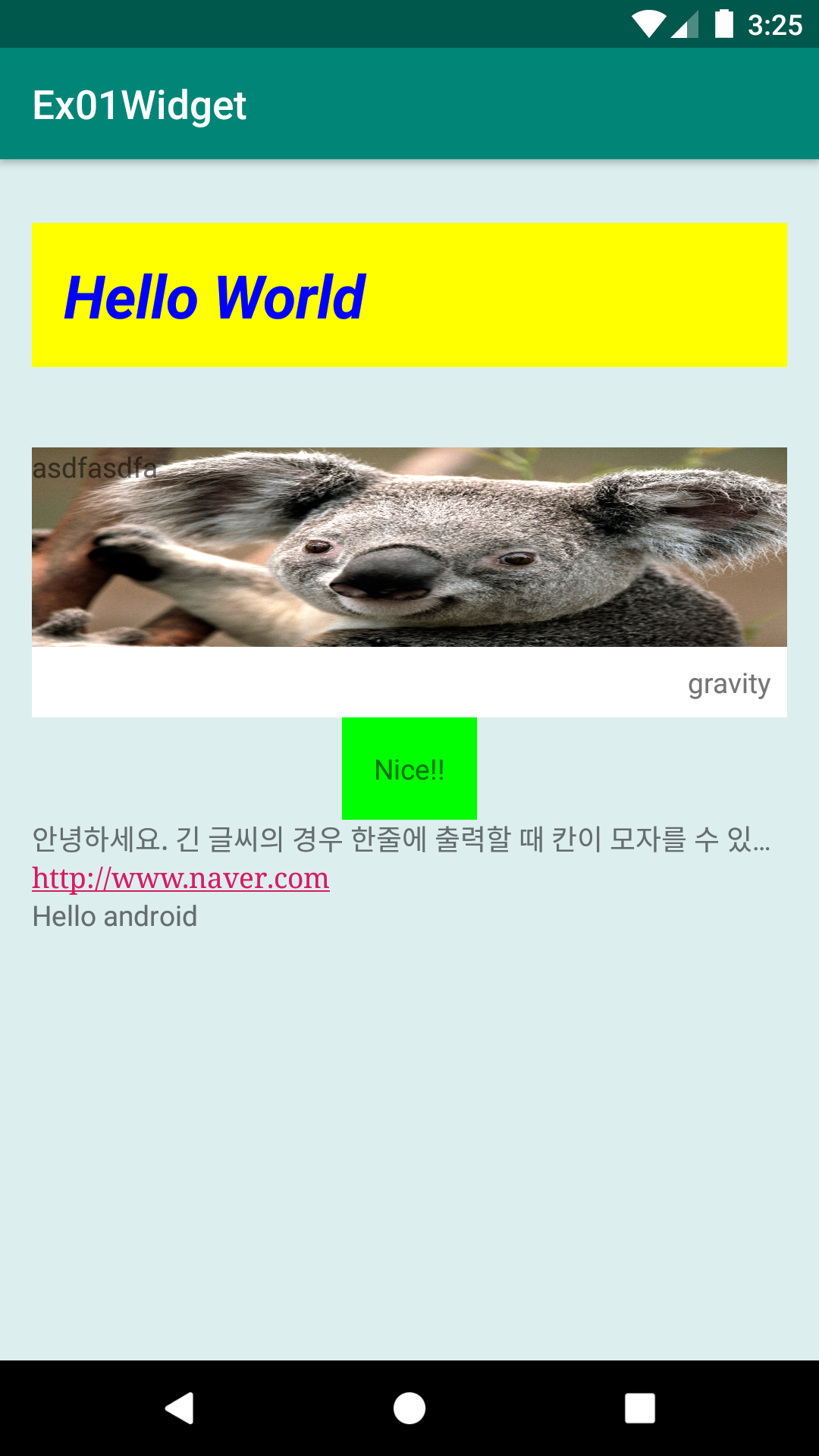 - 글씨를 보여주는 TextView를 통해 뷰의크기, 색상, 배경, 패딩, 마진, 정렬, autoLink등에 대해 알아보는 예제