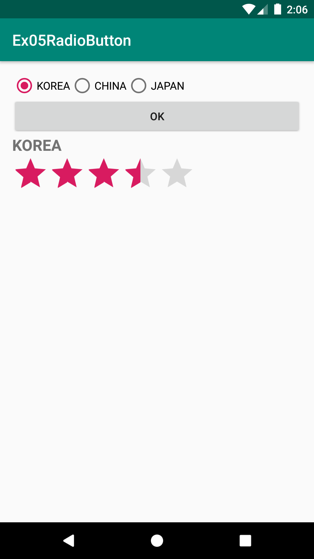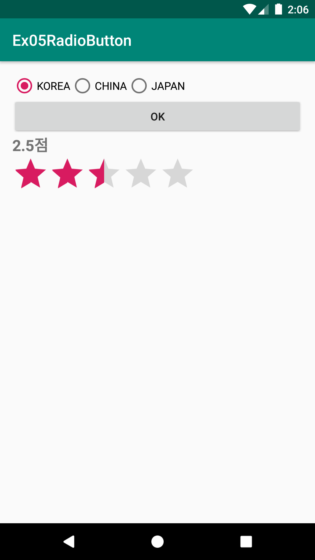 - RatingBar 위젯의 사용법은 다른 복합버튼들과 비슷함. 다만, 레이팅값의 변화 리스너객체 OnRatingBarChangeListener를 사용해야하는 것이 다름.