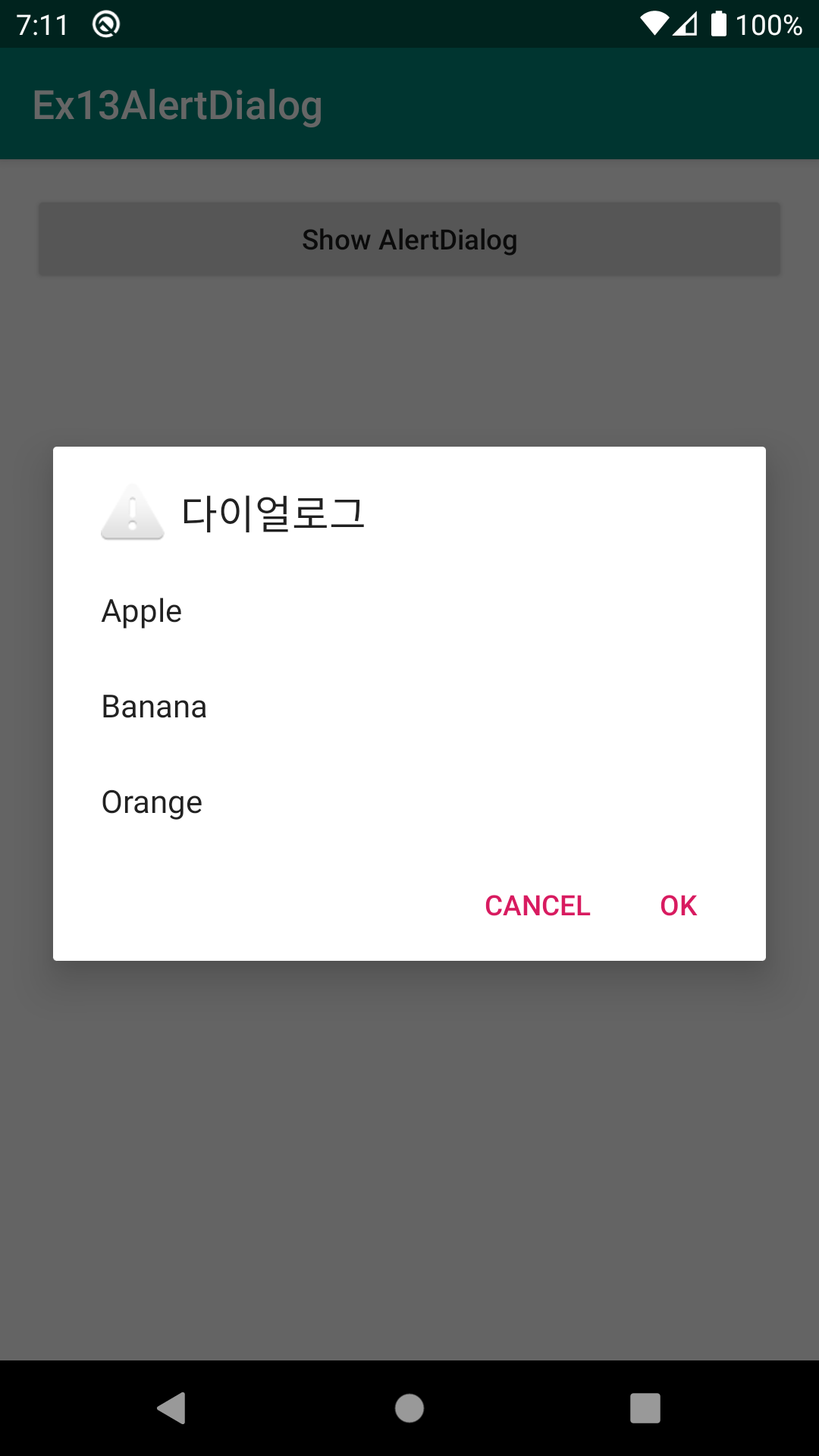 //2.2) AlertDialog의 메세지 영역에 단순 문자열이 아닌 항목(list)형태로 메세지영역 설정해 보기