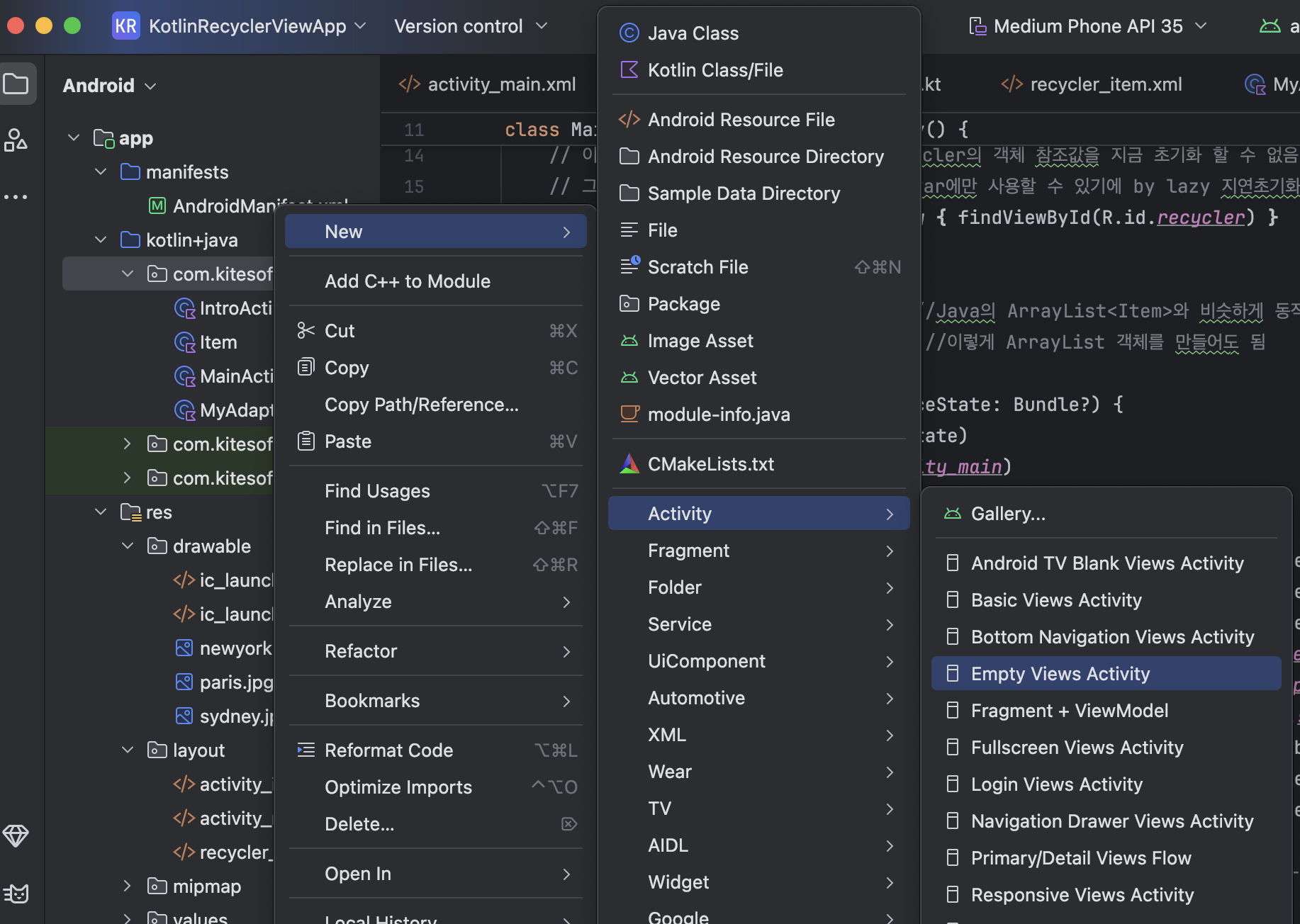 여기까지 해서 앱을 구현할 때 가장 많이 사용하는 액티비티 전환과 리사이클러뷰를 코틀린으로 만들어 보았습니다.