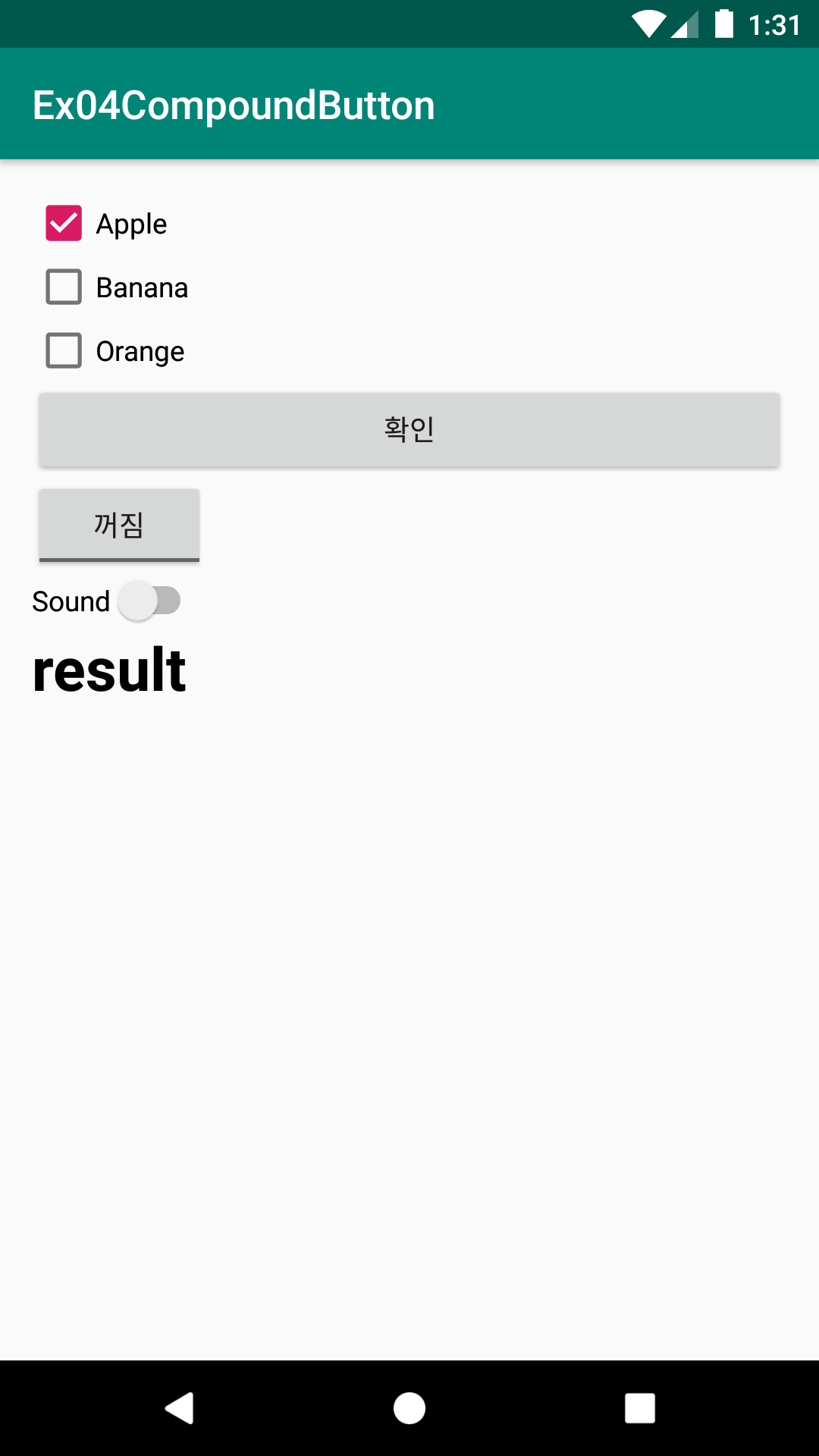 - CheckBox 3개와 Button 1개, TextView 1개를 만들어 버튼이 클릭되었을 때 선택(Selected)되어 있는 CheckBox들의 텍스트를 얻어와 TextView에 표시하기
