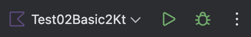 새로 만든 Test02Basic2.kt 문서만 따로 실행할 수 있도록 문서의 빈 공간에서 마우스 우클릭하여 나타난 팝업 메뉴에서 해당 문서의 Run메뉴를 실행하면 안드로이드 스튜디오 상단메뉴의 run 메뉴 툴바의 대상이 아래그림처럼 Test02Basic2Kt로 된 것을 확인할 수 있습니다.