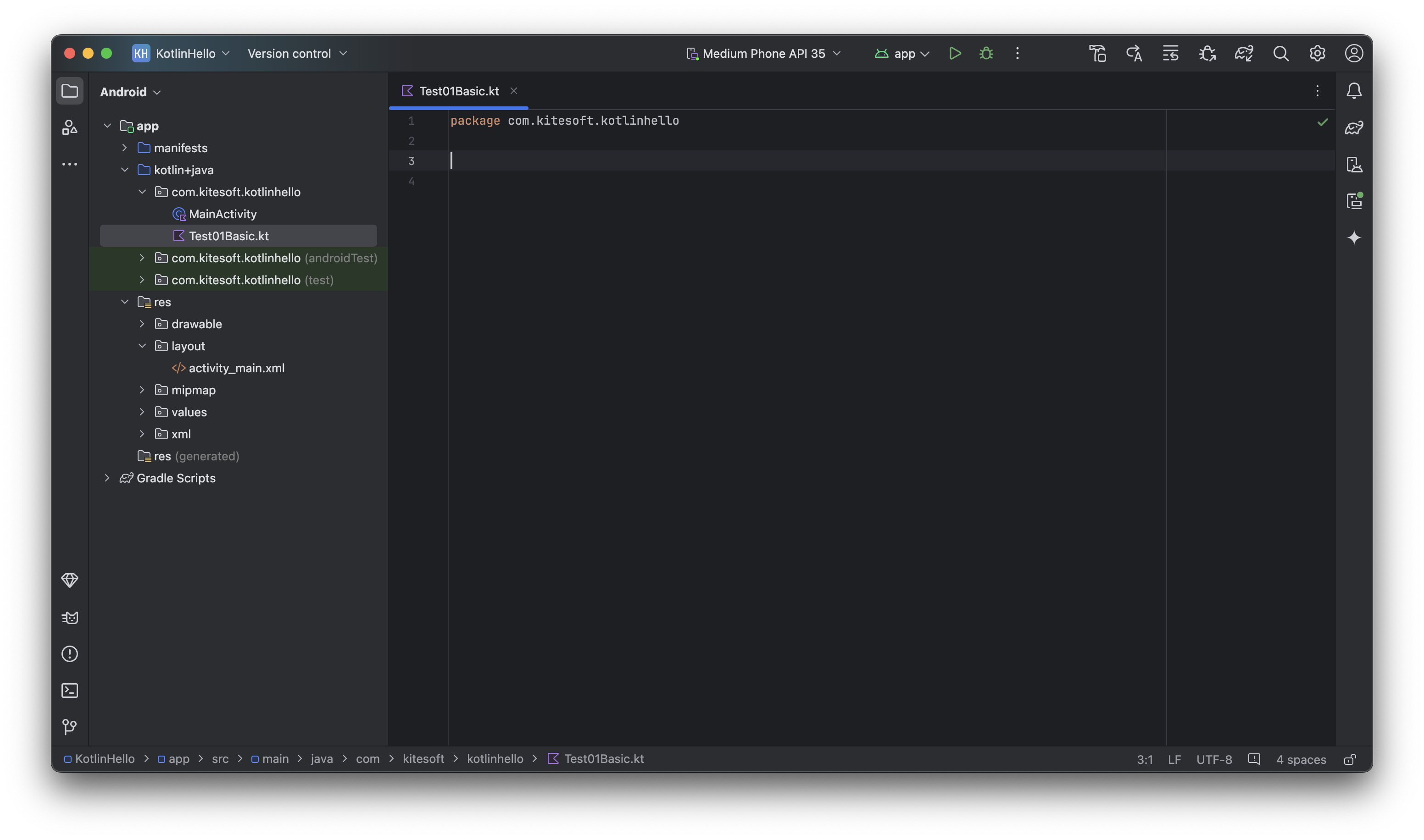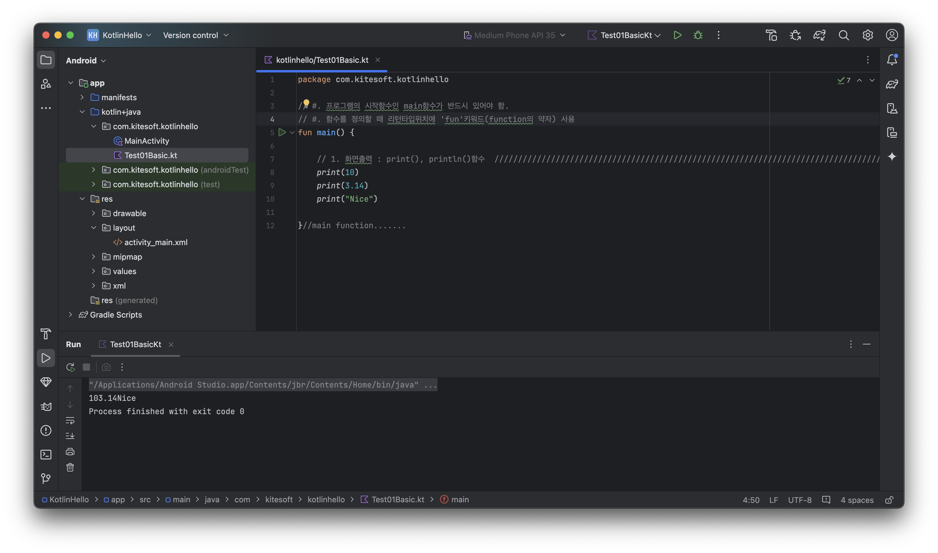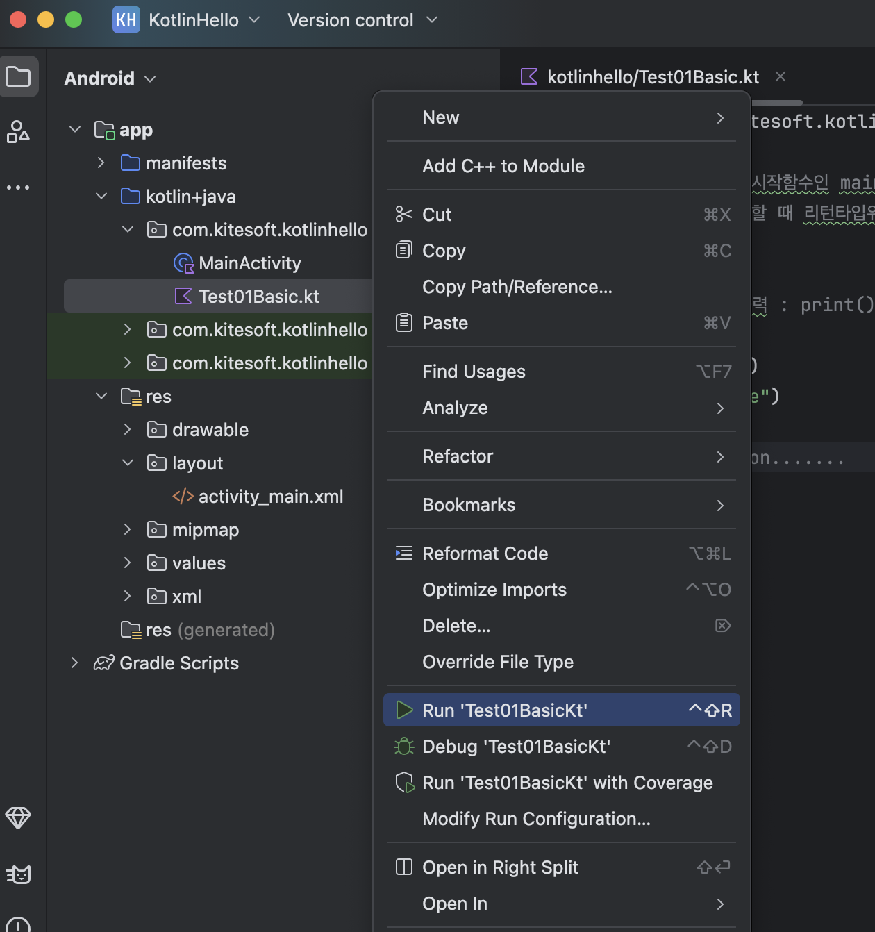 실행되면 상단메뉴의 [run] 아이콘쪽이 app 모듈에서 Test01BasicKt 로 변경되어 있을 것을 확인할 수 있습니다.