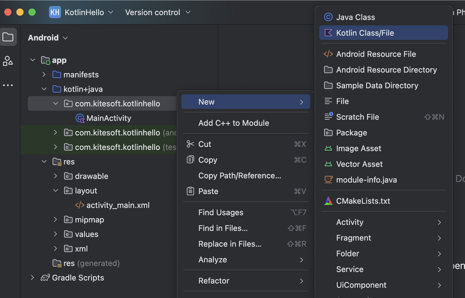 먼저. 코틀린언어를 작성하기 위해 별도의 파일을 만들어야 겠지요. 별도의 Project를 다시 생성할 필요는 없습니다. 현재 KotlinHello 프로젝트의 MainActivity.kt 파일이 있는 패키지에서 코틀린 파일을 만들어 실습을 진행하겠습니다.