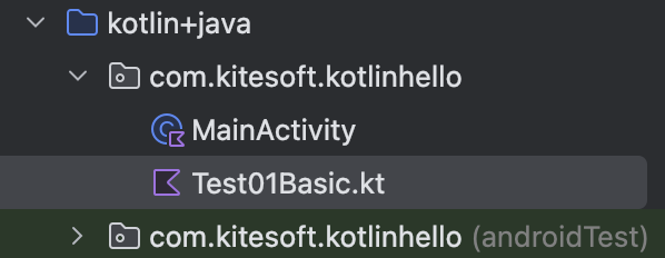 파일명을 작성하고 엔터키를 누르면 Test01Basic.kt 파일이 만들어진 것을 볼 수 있습니다. 근데 같은 코틀린파일인 MainActivity 는 뒤에 .kt 확장자가 없네요?