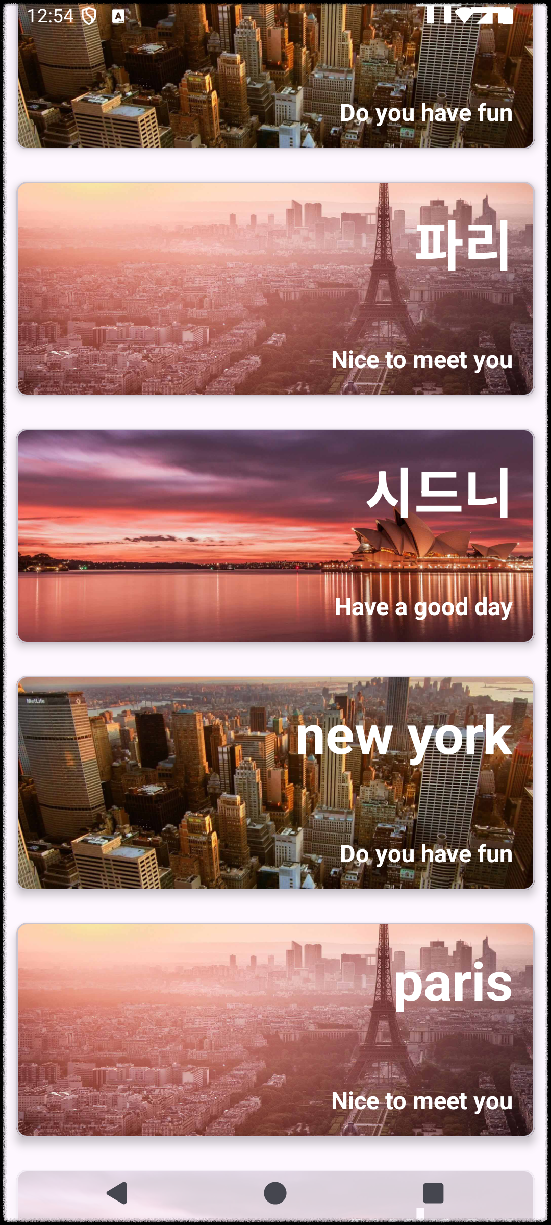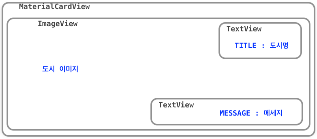 앞서 언급했듯이 가급적 간결하게 아이템뷰를 구성하고자 합니다. 여행지 정보를 보여주는 앱이라고 가정하고 아래 모양처럼 구성하고자 합니다. 아이템뷰 당 이미지 1개, 제목글씨 1개, 메세지 글씨 1개로 구성하고자 합니다.